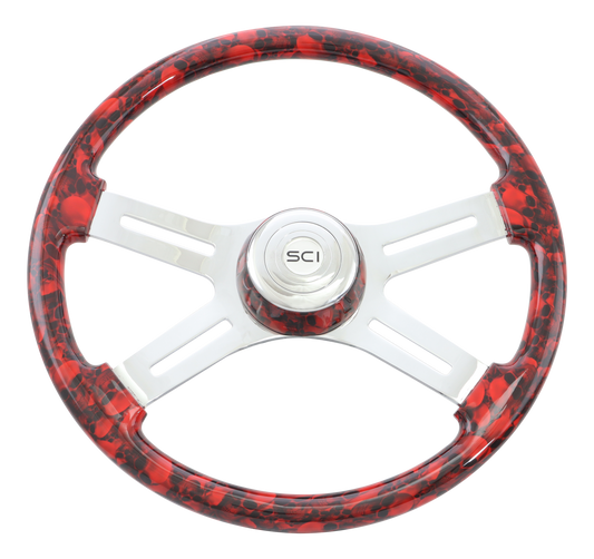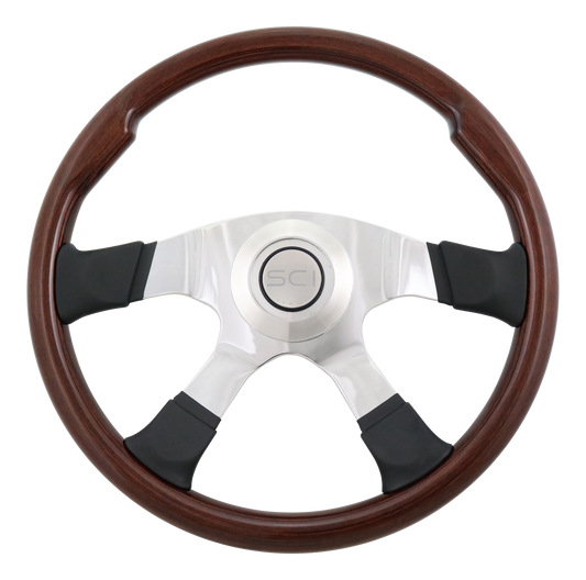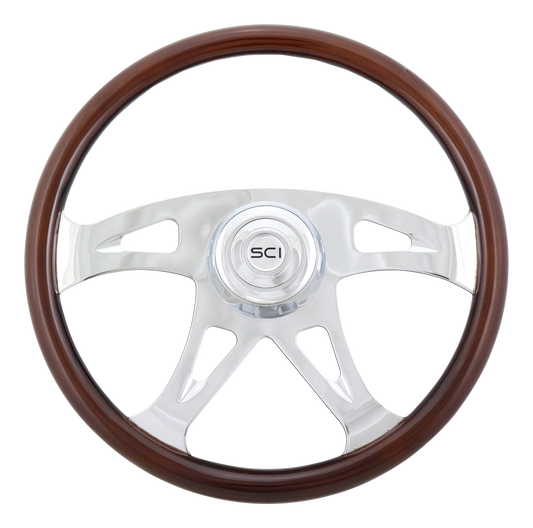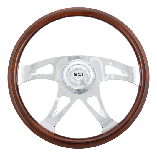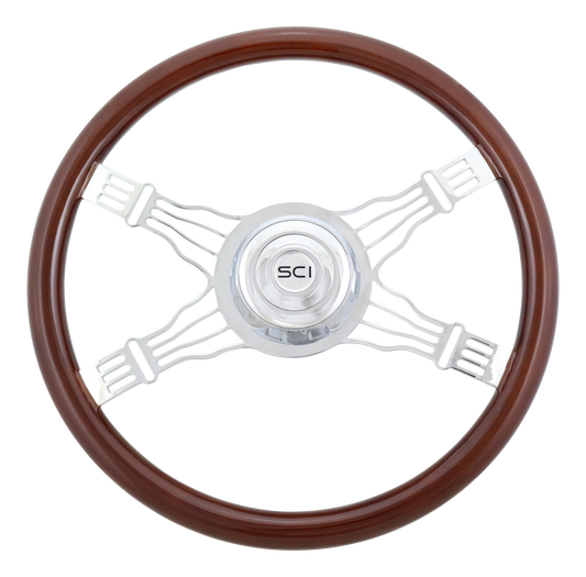 Steering Wheel Voltage 4 - 18" Wood Rim, Chrome 4-Spoke w/Wire Cut Outs, Chrome Bezel, Chrome Horn Button - SCI Logo
