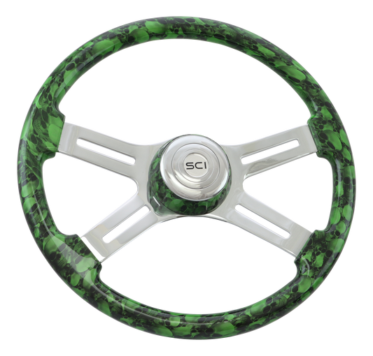 Steering Wheel Big Skulls Green - 18" Printed Wood Rim, Chrome 4-Spoke w/ Slot Cut Outs, Matching Bezel, Chrome Horn Button - SCI Logo