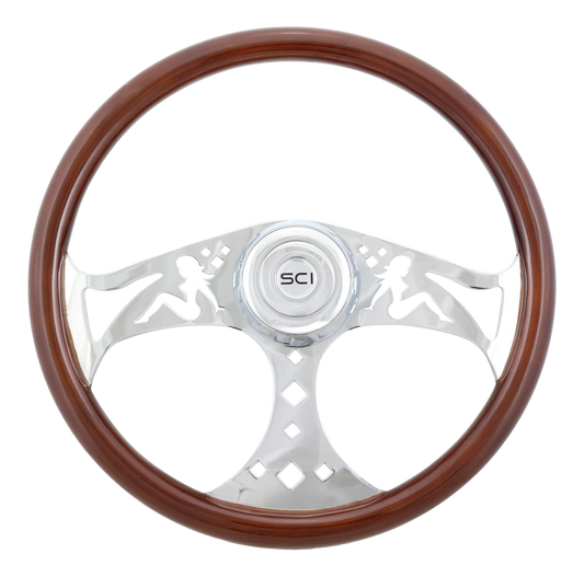 Steering Wheel Mud Flap Girl - 18" Wood Rim, Chrome 3-Spoke w/Cut Outs, Chrome Bezel, Chrome Horn Button - SCI Logo