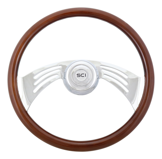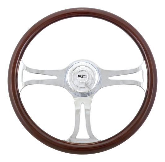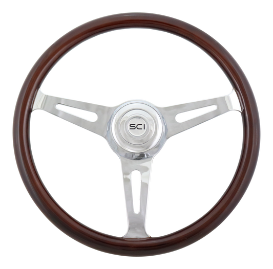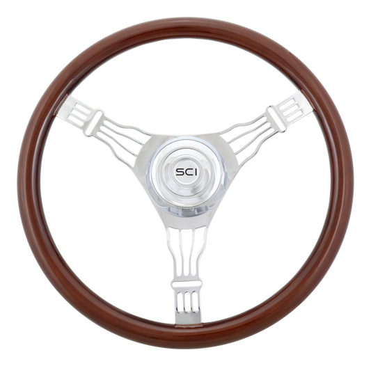 Steering Wheel Blaze - 18" Wood Rim, Chrome 3-Spoke w/Cut Outs, Chrome Bezel, Chrome Horn Button - SCI Logo