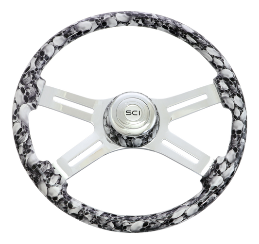 Steering Wheel Big Skulls White - 18" Printed Wood Rim, Chrome 4-Spoke w/ Slot Cut Outs, Matching Bezel, Chrome Horn Button - SCI Logo