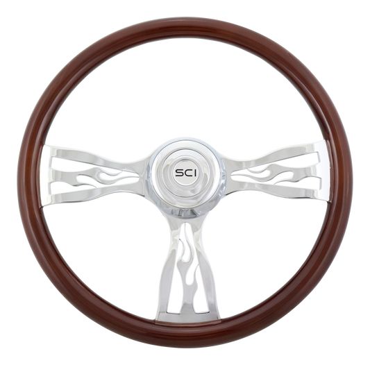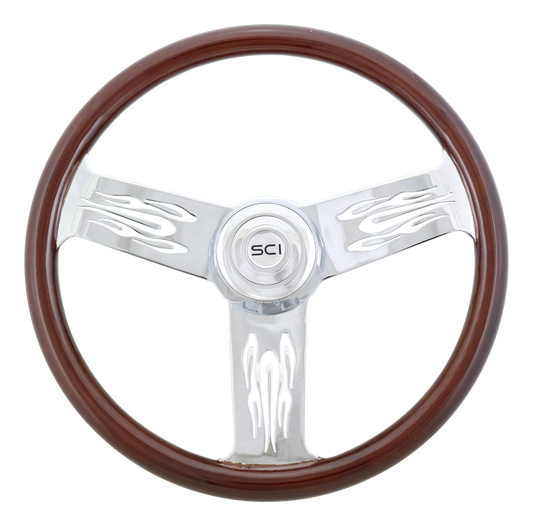 Steering Wheel Flames - 18" Wood Rim, Chrome 3-Spoke w/Flame Cut Outs, Chrome Bezel, Chrome Horn Button - SCI Logo