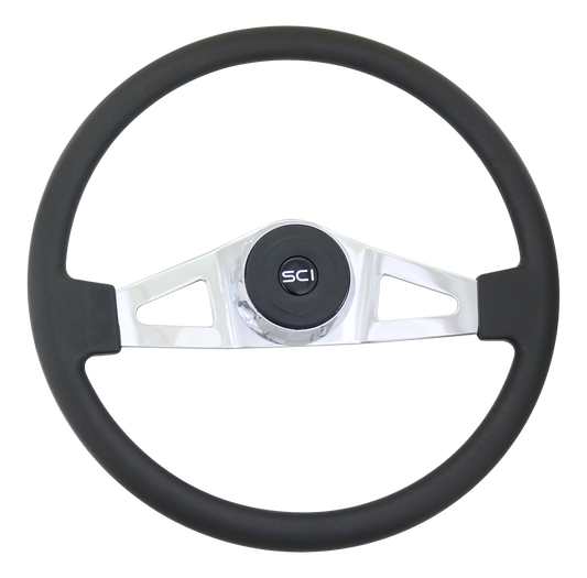 Steering Wheel Jasper - 18" Polyurethane Rim, Polished Chrome 2-spoke w/Slot Cut Outs, Black Textured Bezel, Black Horn Button - SCI Logo