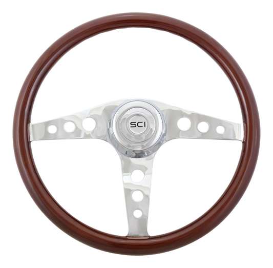 Steering Wheel Racer - 18" Wood Rim, Chrome 3-Spoke w/Round Cut Outs, Chrome Bezel, Chrome Horn Button - SCI Logo