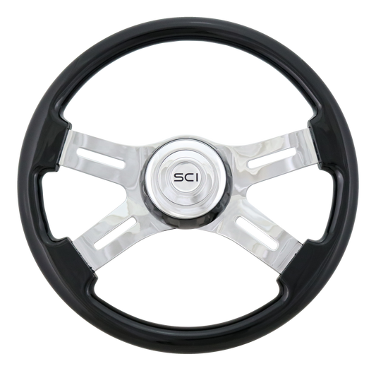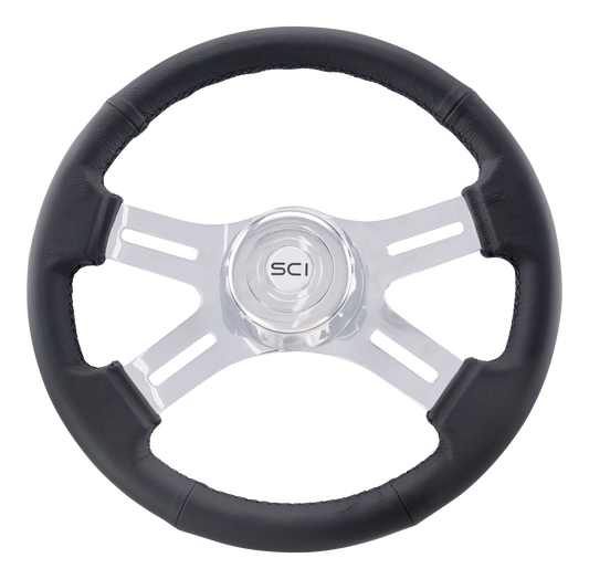 16" Classic Leather - 16" Black Leather Rim, Chrome 4-Spoke w/Slot Cut Outs, Chrome Bezel, Chrome Horn Button - SCI Logo