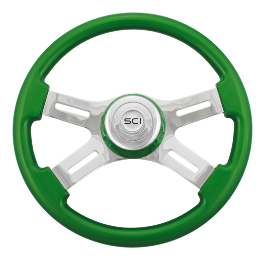 16" Classic Green - Painted Steering Wheel Wood Rim, Chrome 4-Spoke w/Slot Cut Outs, Green Bezel, Chrome Horn Button