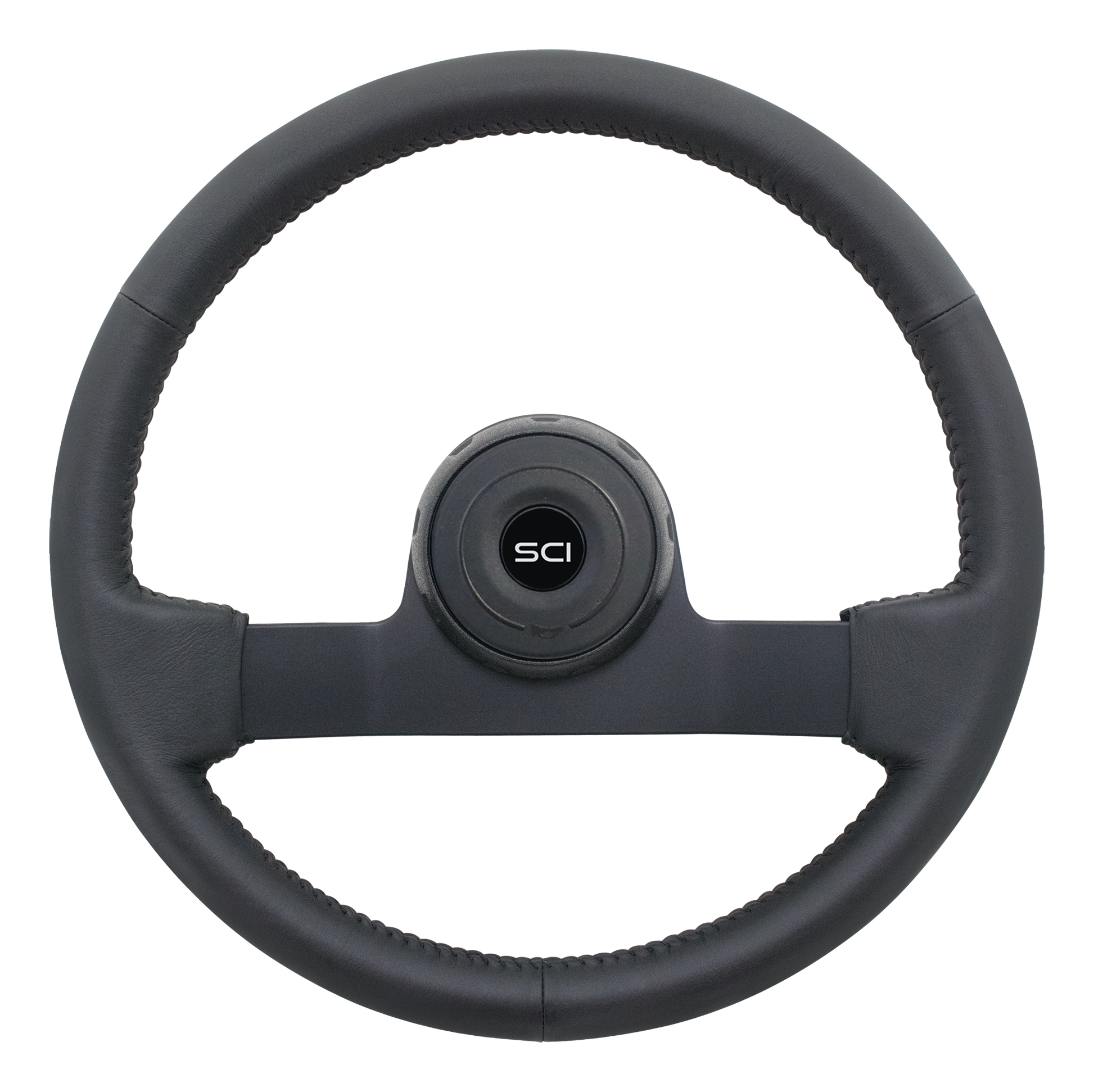 16" Black Leather Rim, Black Powder Coated 2-Spoke, Black Textured Bezel, Black Horn Button w/ Black SCI logo