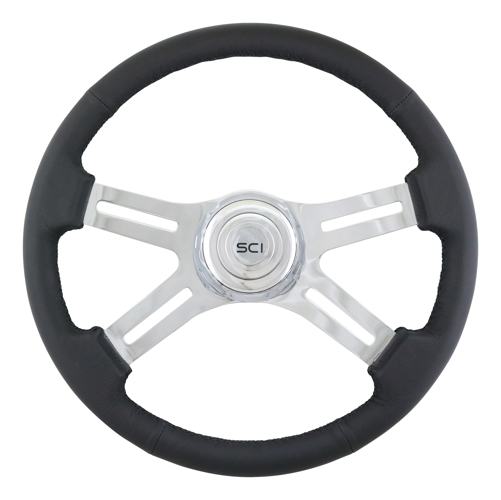 Steering Wheel 18" Black Leather Rim, Chrome 4-Spoke w/Slot Cut Outs, Chrome Bezel, Chrome Horn Button - Logo
