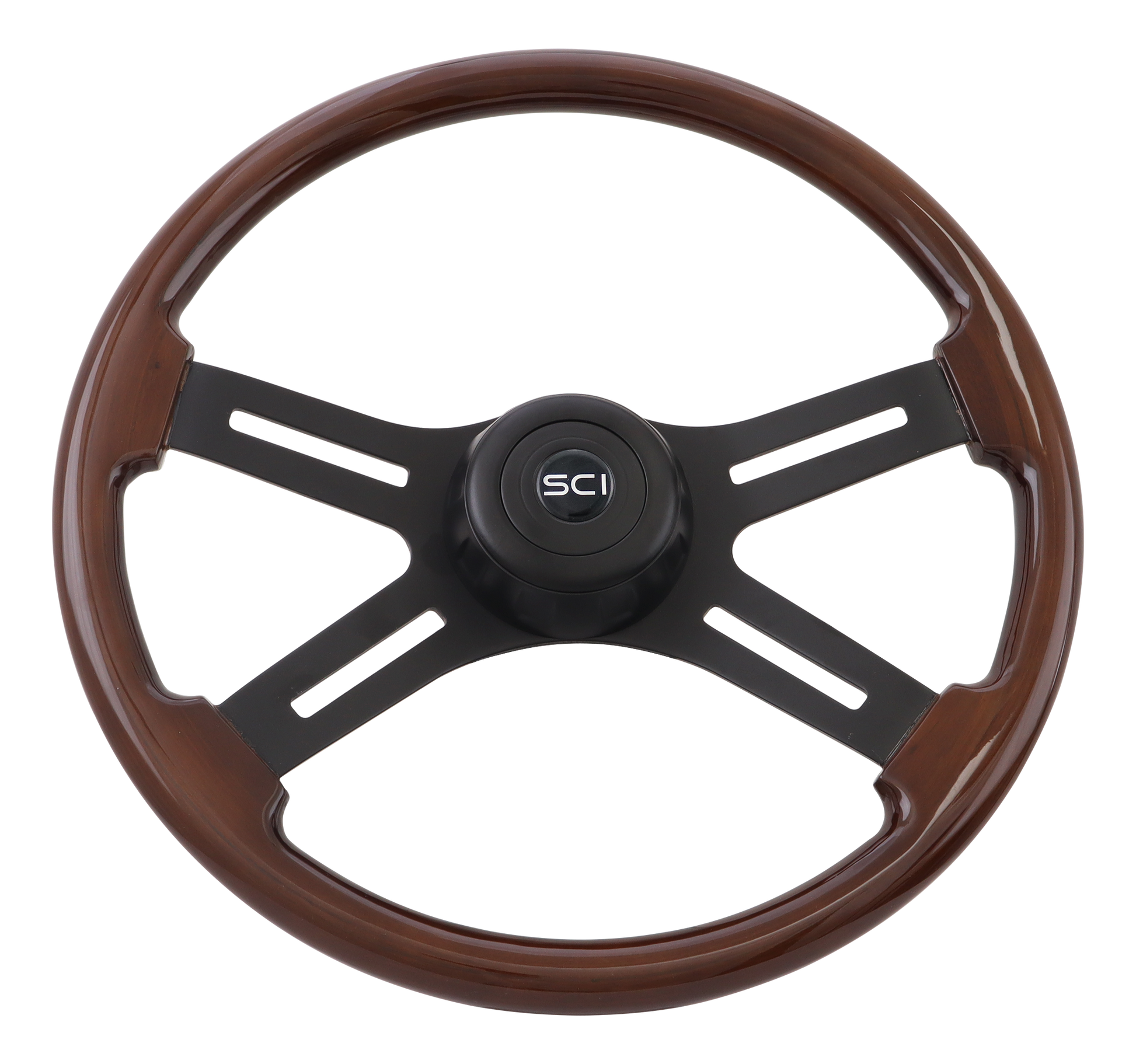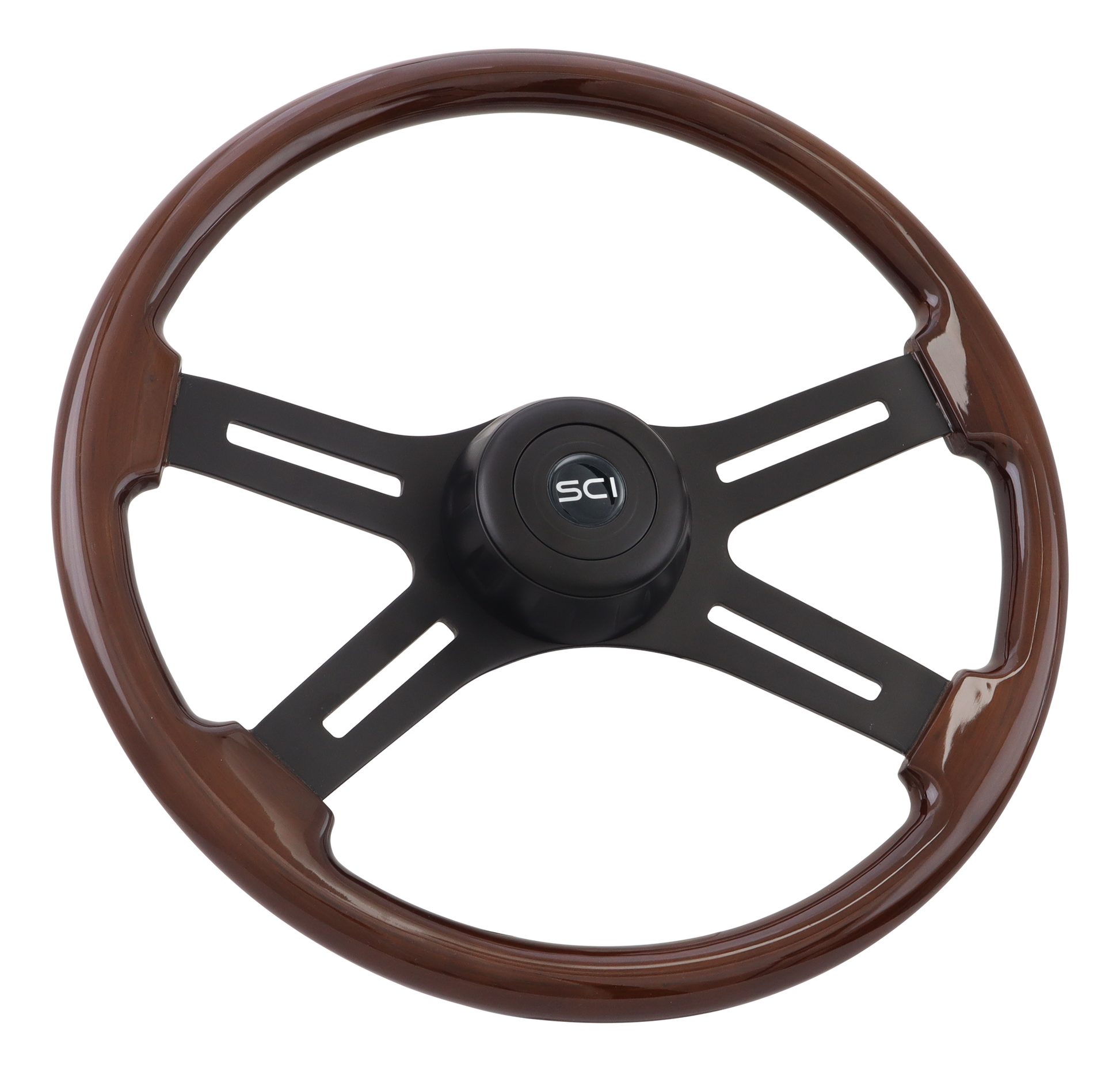 18" "Midnight Mahogany" Steering Wheel Matte Black 4-Spoke w/Slot Cut Outs, Matte Black Bezel, Matte Black HB