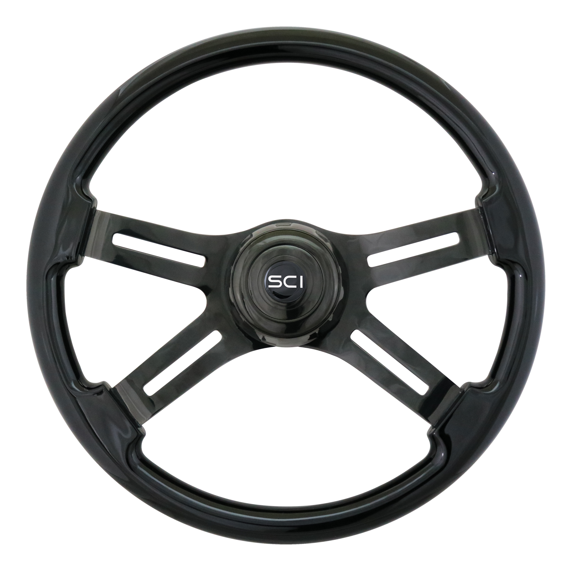 18" Phantom Steering Wheel Painted Wood Rim, Black Chrome 4-Spoke w/Slot Cut Outs, Black Chrome Bezel, Black Chrome Horn Button w/Black SCI Logo