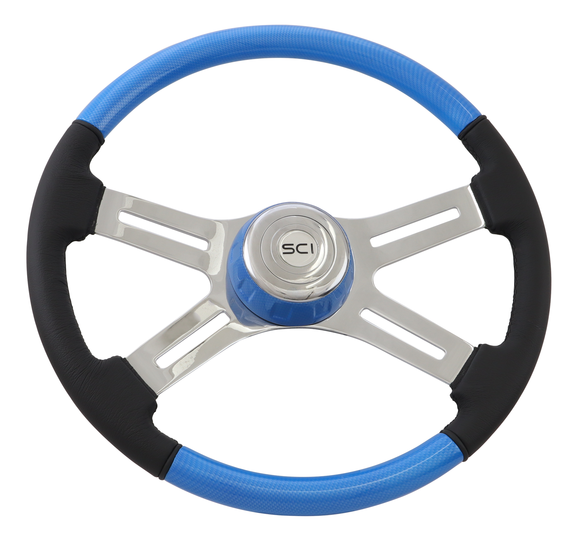 18" Steering Wheel Combo "Blue" Carbon Fiber - Painted Wood & Leather Rim, Chrome 4-Spoke w/ Slot Cut Outs, Matching Bezel,