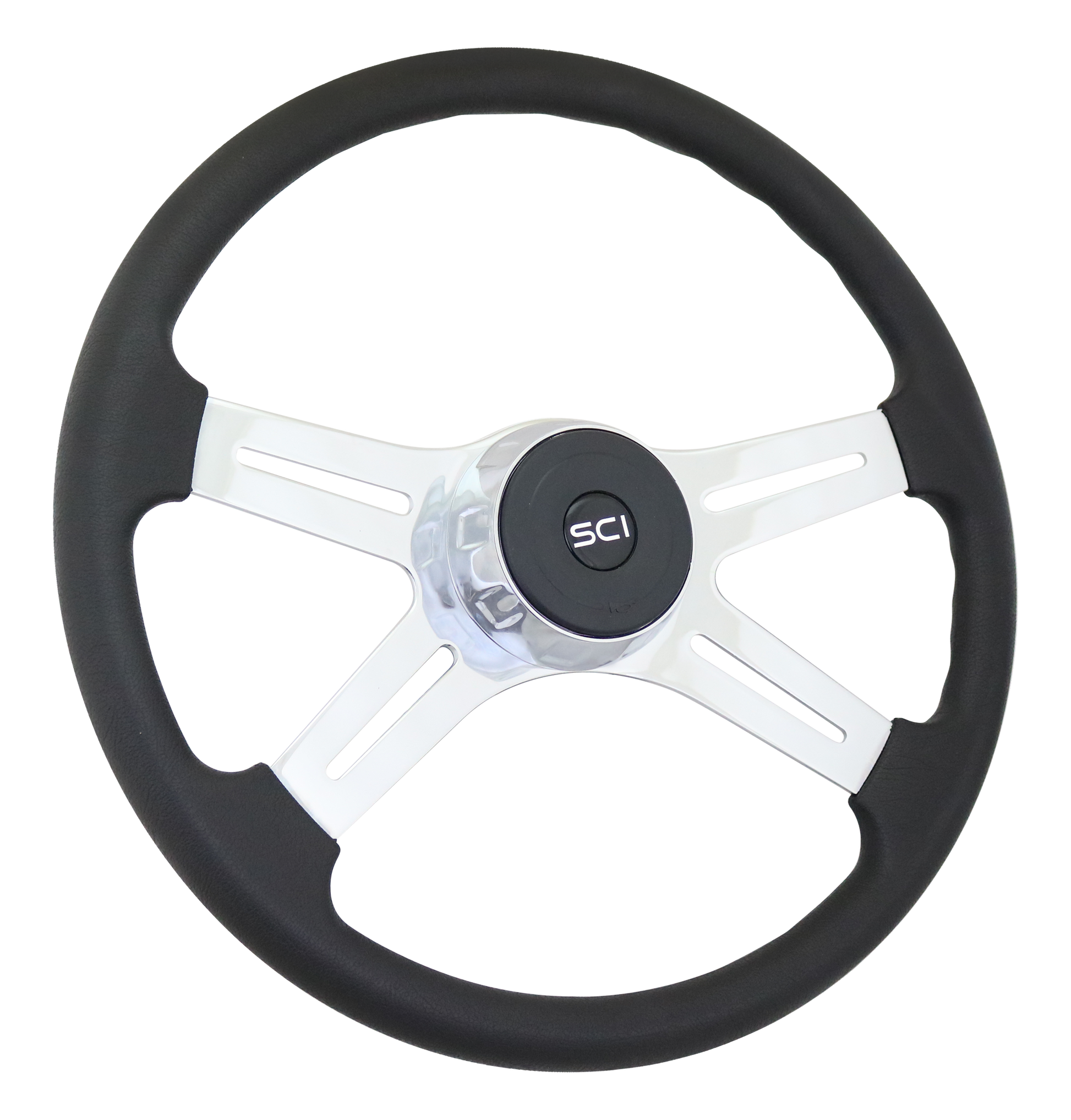 18" Polyurethane, Polished Chrome Spokes 4-spoke, w/Slot Cut Outs, Chrome Bezel, Black Horn Button w/ Black SCI logo