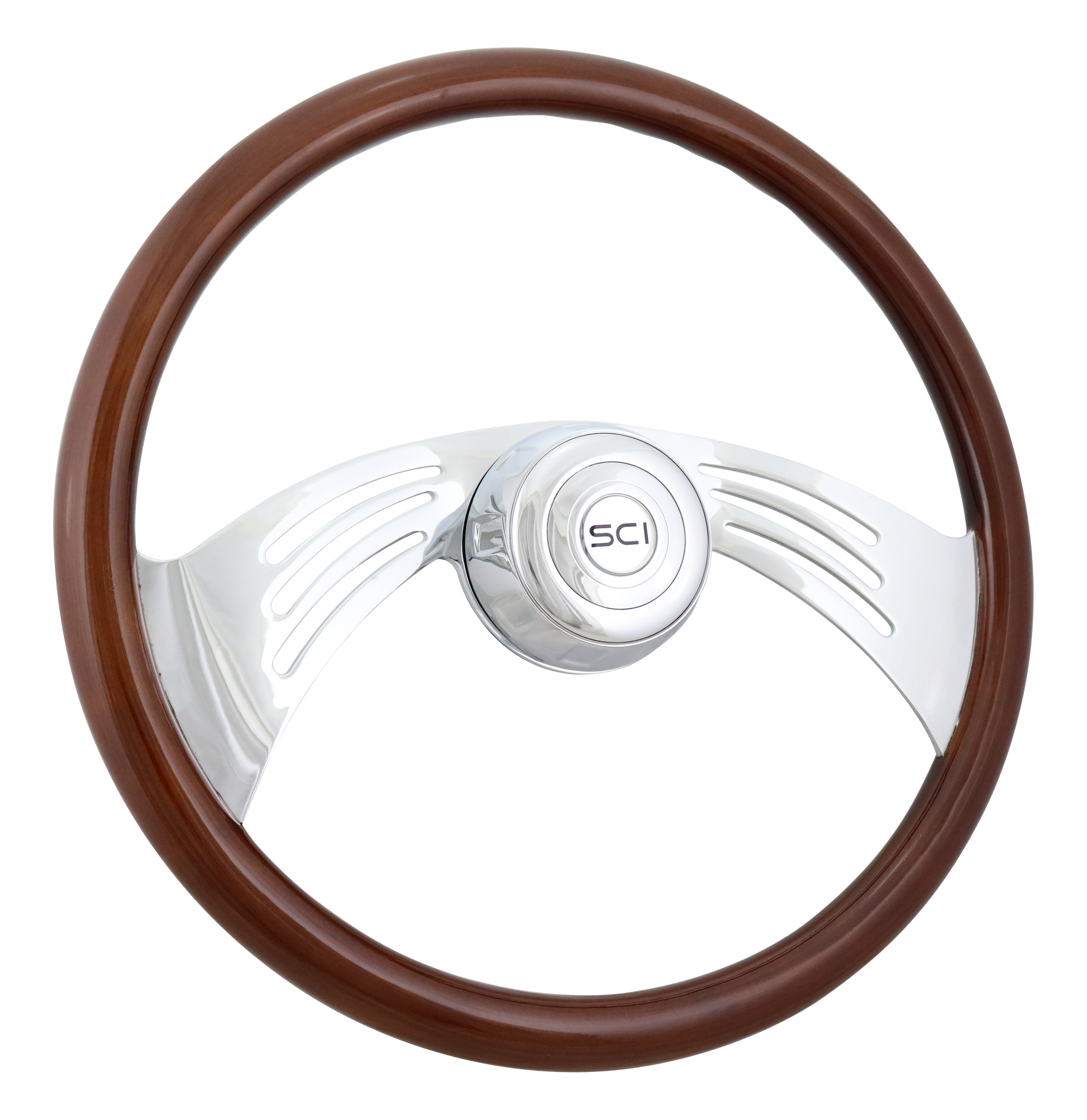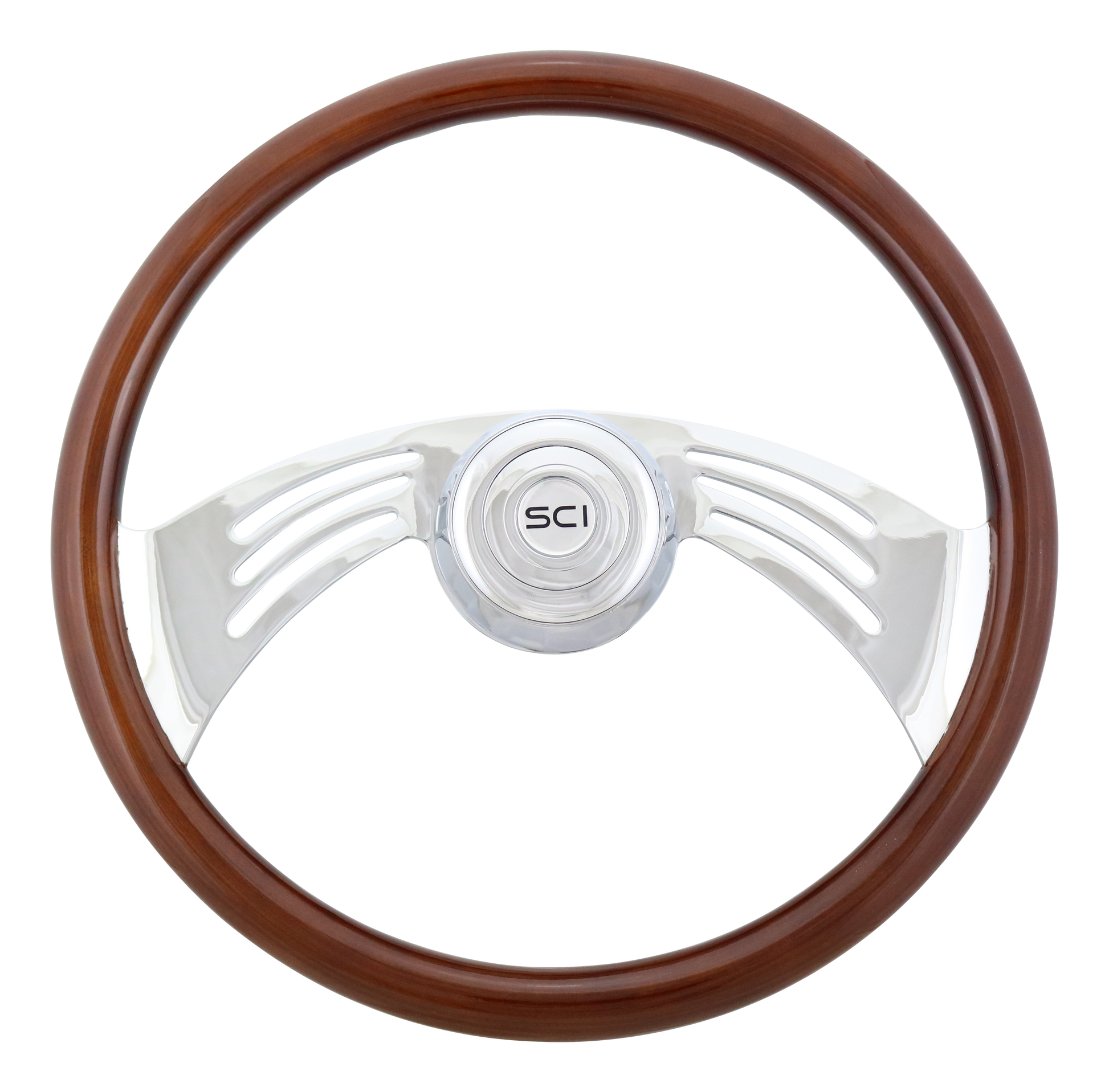 Steering Wheel Flight - 18" Wood Rim, Chrome 2-Spoke w/Cut Outs, Chrome Bezel, Chrome Horn Button - SCI Logo