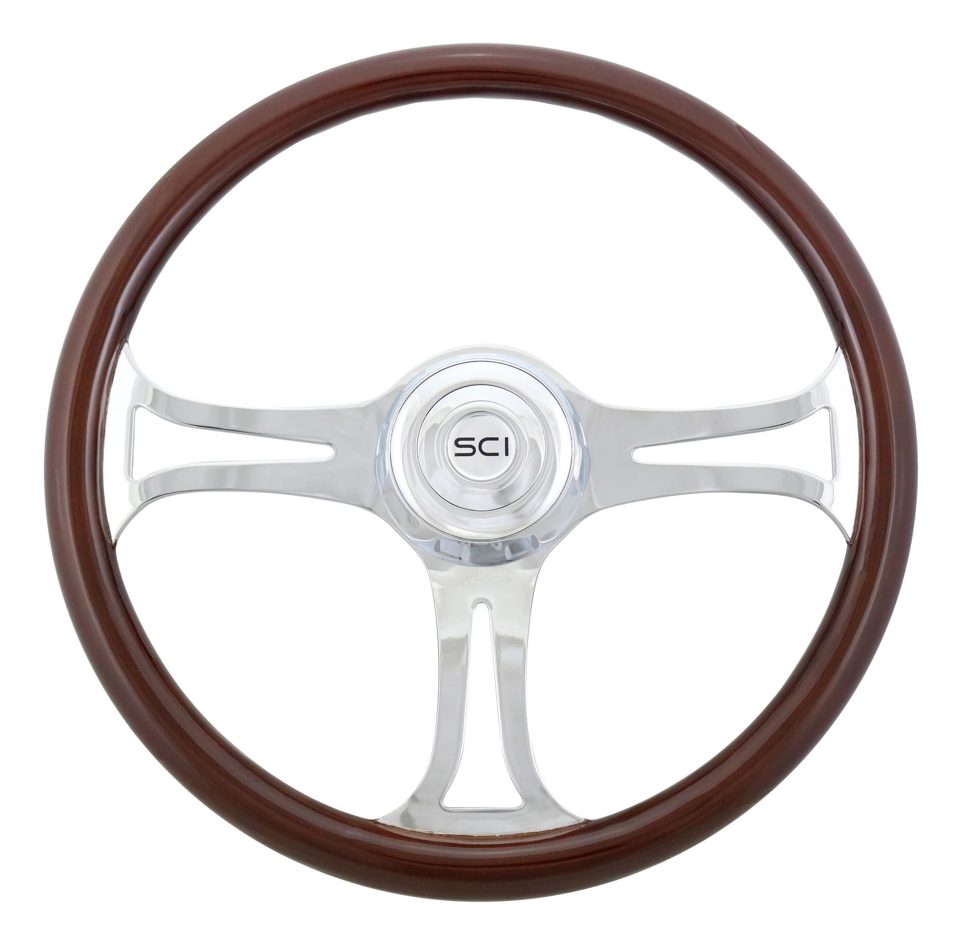 Steering Wheel Saber - 18" Wood Rim, Chrome 3-Spoke w/Cut Outs, Chrome Bezel, Chrome Horn Button - SCI Logo