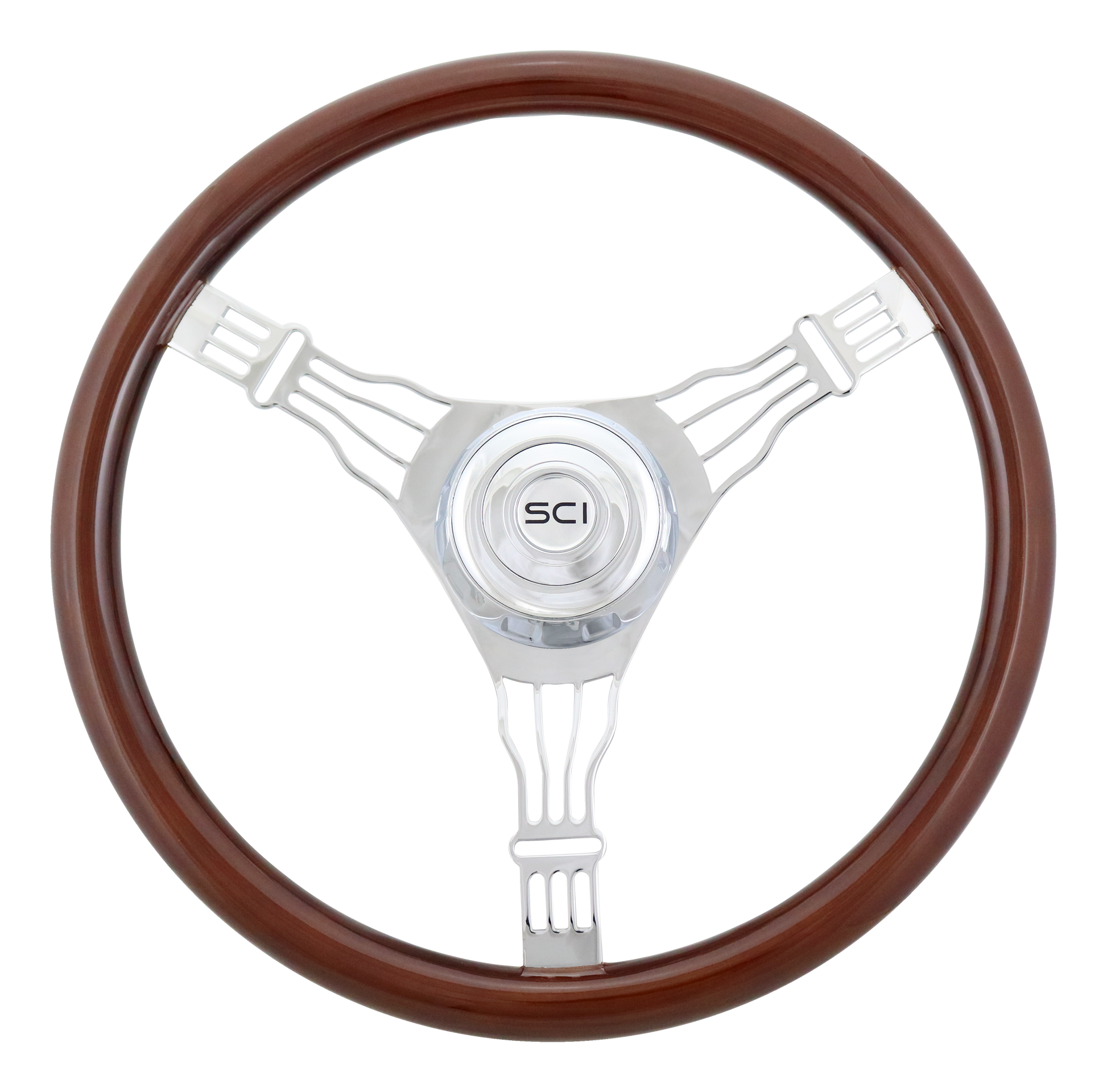 Steering Wheel Voltage 3 - 18" Wood Rim, Chrome 3-Spoke w/ Wire Cut Outs, Chrome Bezel, Chrome Horn Button - SCI Logo