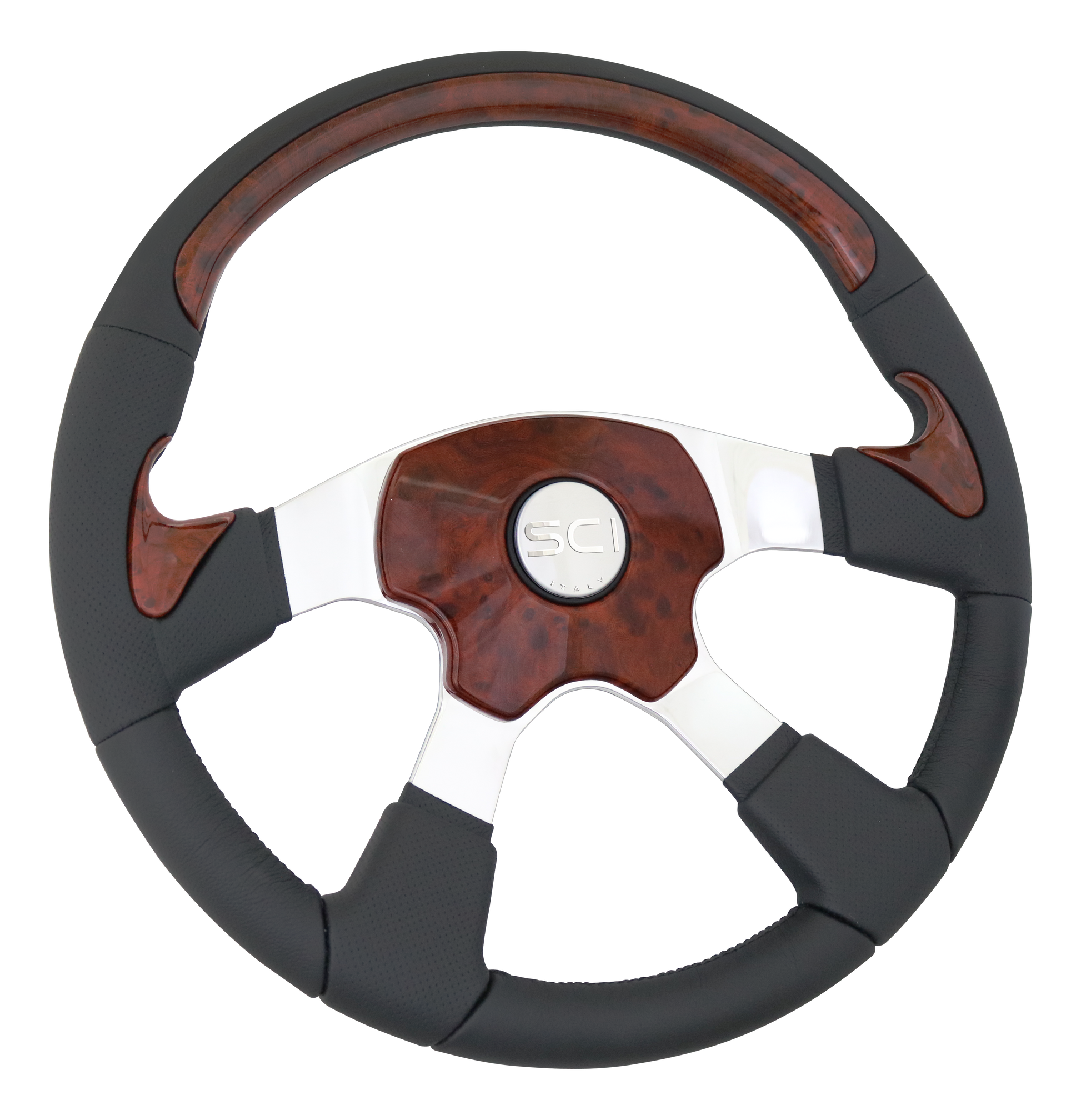 Traveler Burl - 18" Leather Rim w/Burl Look Inserts, Polished Aluminum 4-Spoke, Elite 4 Burl Look Pad, SCI Horn Button - Silver