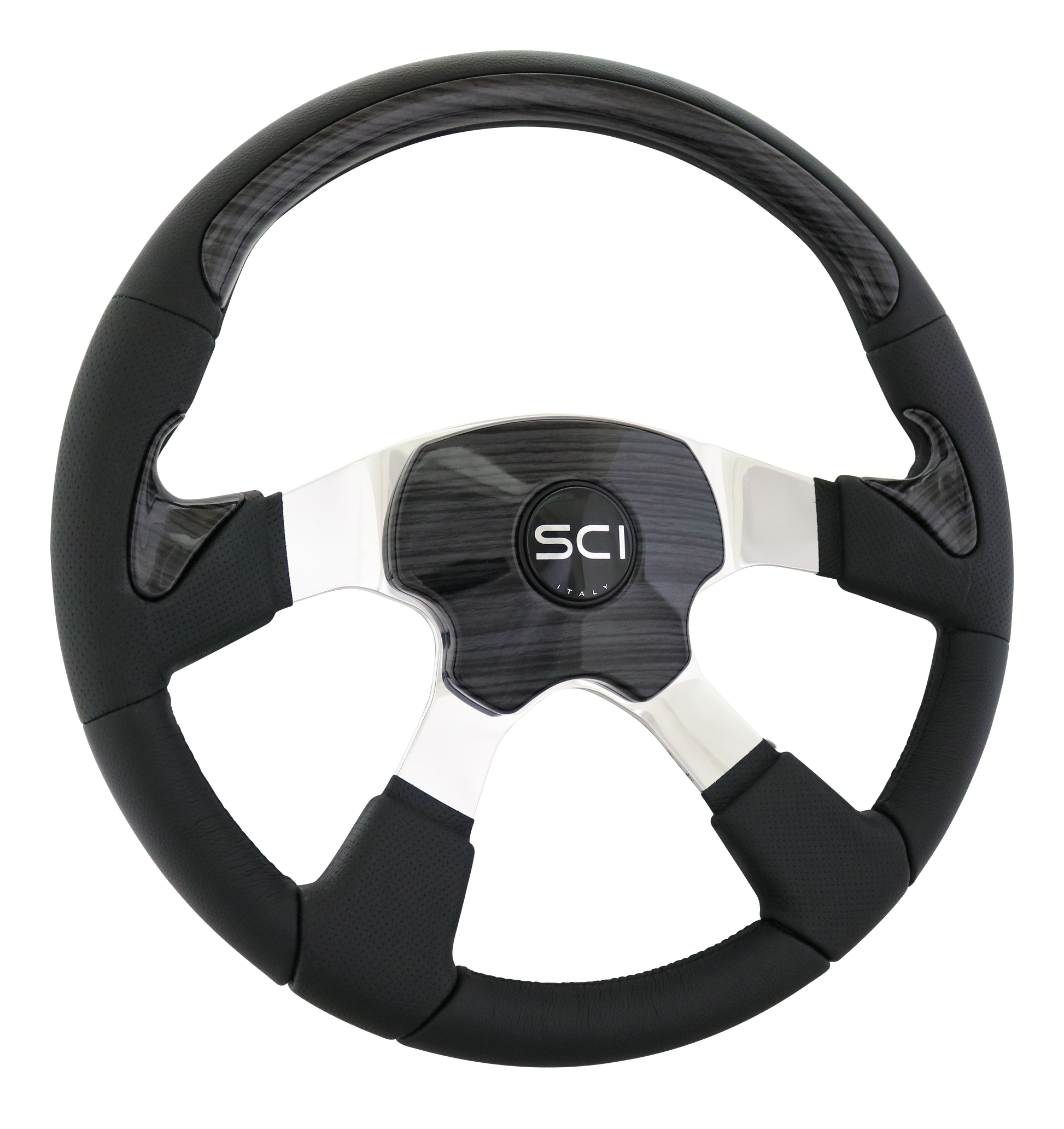 18" Leather Rim w/Black Wood Look Painted Inserts, Polished Aluminum 4-Spoke Steering Wheel, Elite 4 – Black Wood Look Pad, SCI Horn Button-Black.