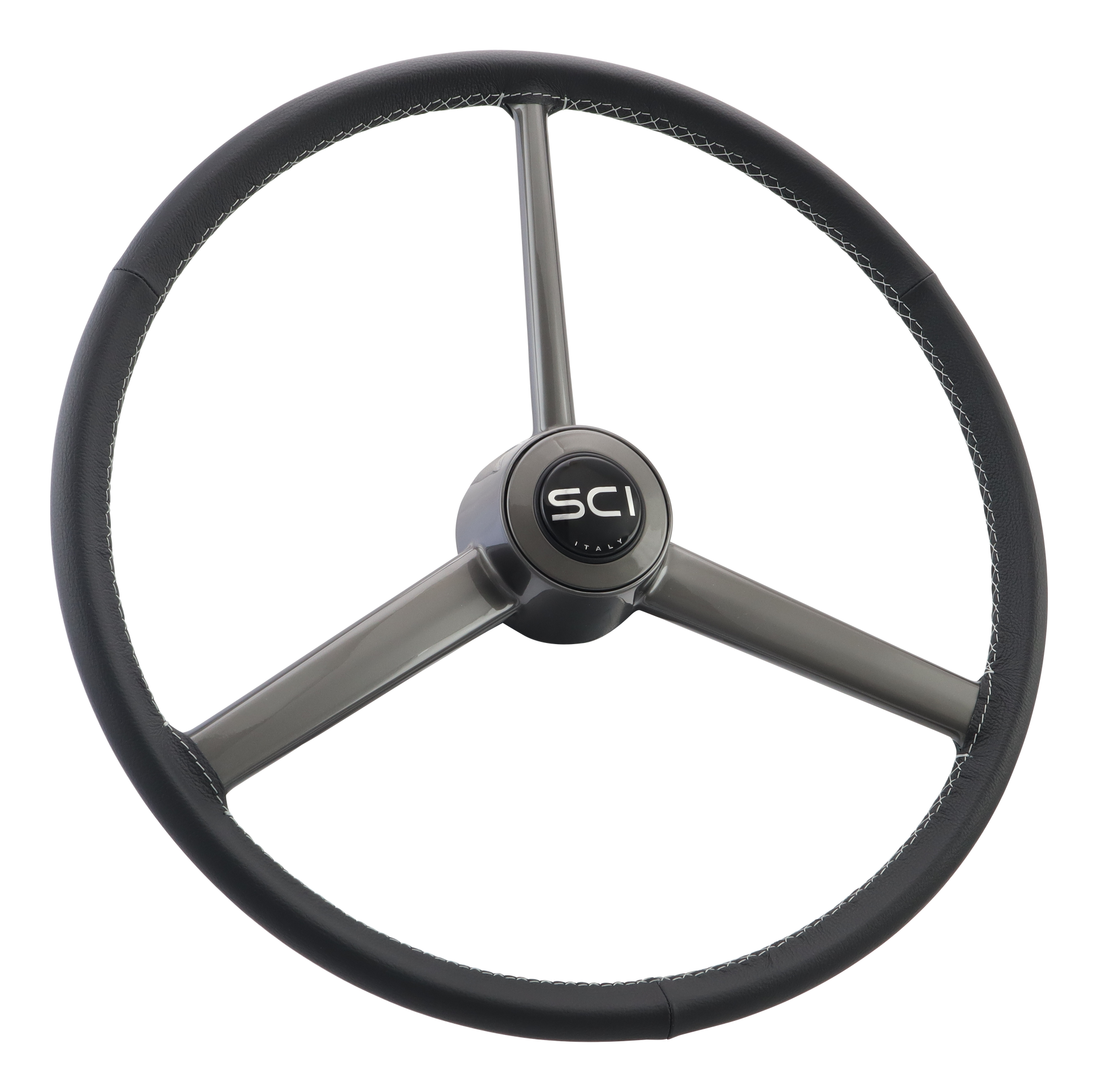 20” Black Leather Rim, Gun Metal Look 3-Spoke, Gun Metal Look Ring, Black SCI Horn Button
