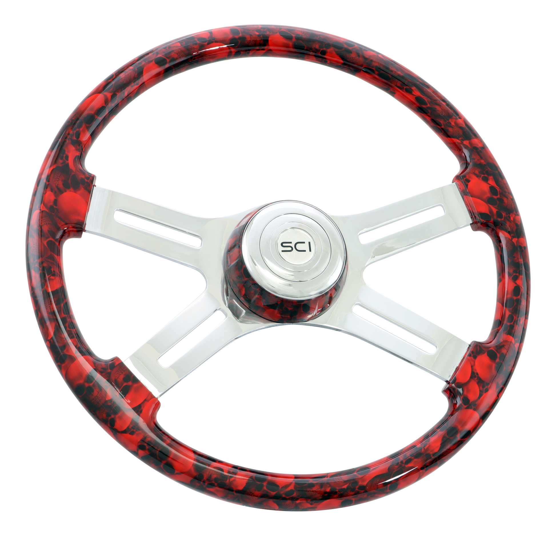 Steering Wheel Big Skulls Red - 18" Printed Wood Rim, Chrome 4-Spoke w/Slot Cut Outs, Matching Bezel, Chrome Horn Button - SCI Logo