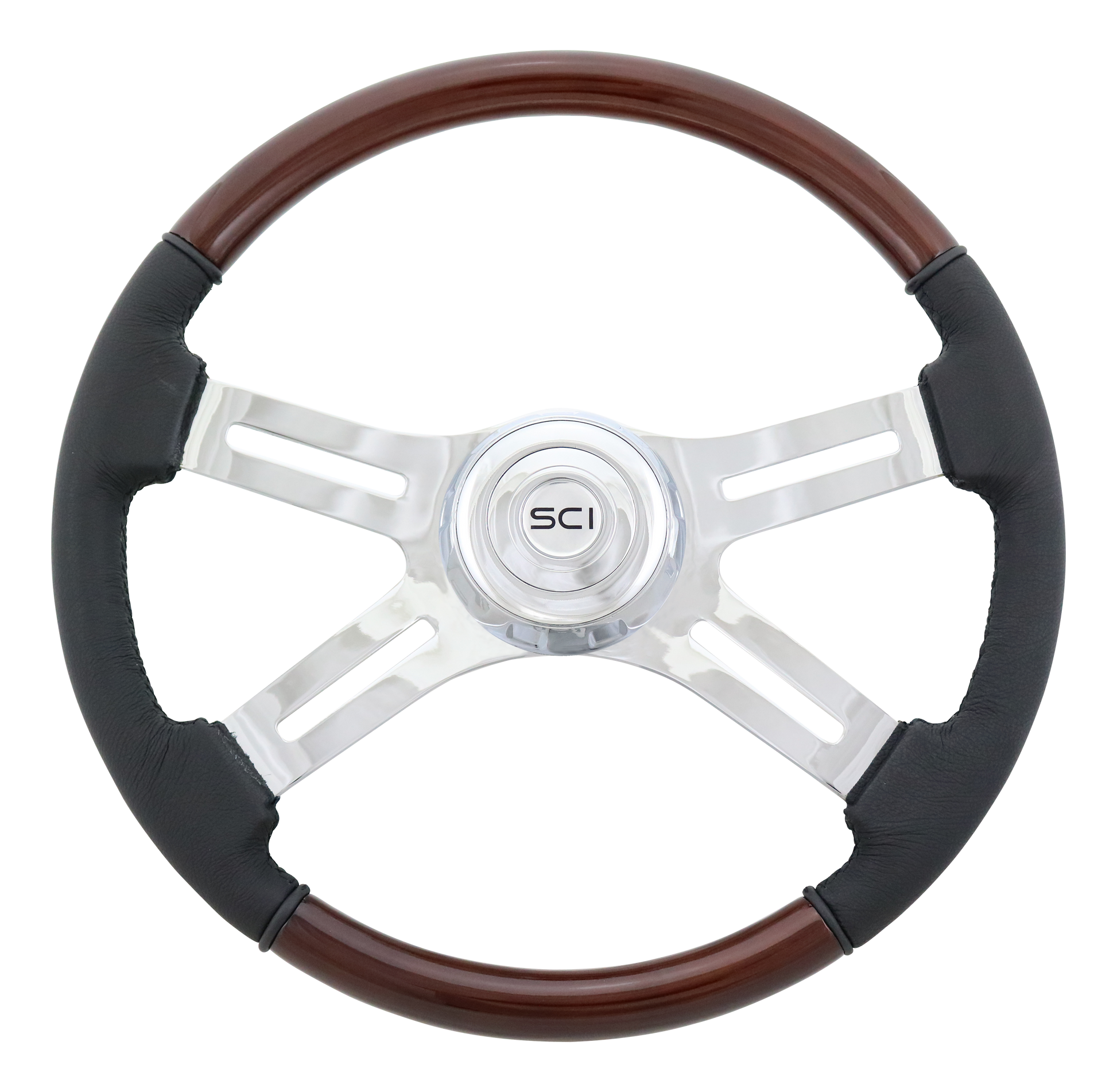 Steering Wheel 18" Wood & Leather Rim, Chrome 4-Spoke w/Slot Cut Outs, Chrome Bezel, Chrome Horn Button - Logo