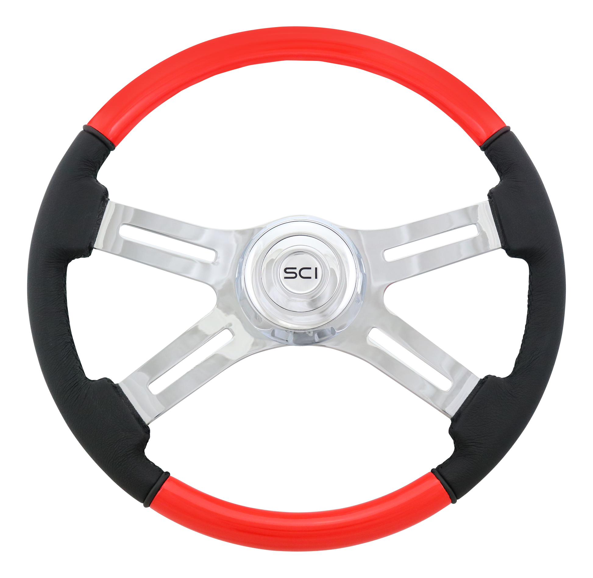 18" Painted Wood & Leather Rim, Chrome 4-Spoke w/ Slot Cut Outs, Chrome Bezel, Chrome Horn Button - Logo