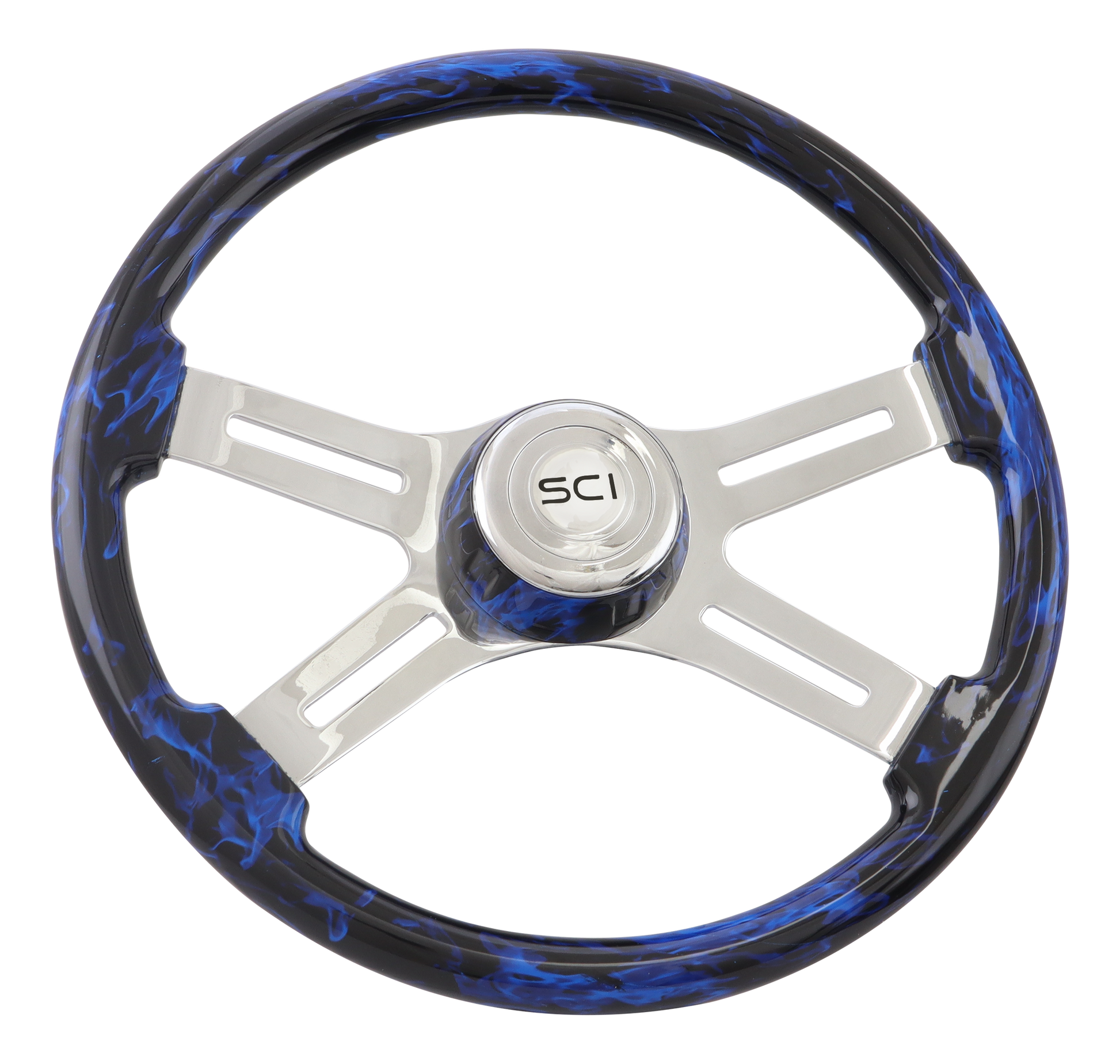 Classic Inferno Blue - 18" Printed Wood Rim, Chrome 4-Spoke w/Slot Cut Outs, Matching Bezel, Chrome Horn Button - SCI Logo