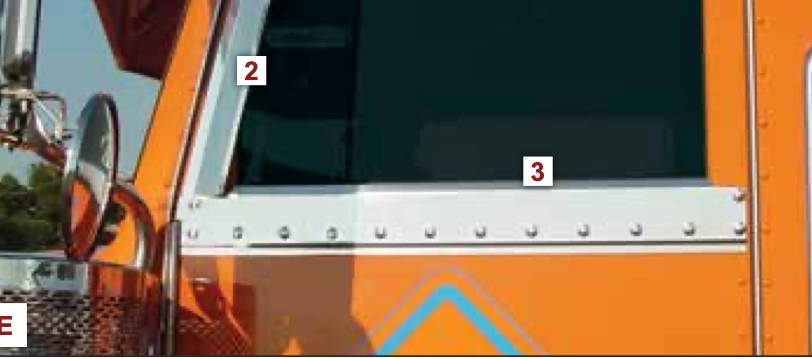 Peterbilt Under Window Trim Fits 325, 330, 335, 337, 340, 347, 348, 357, 365, 367, 375, 377, 378, 379, 382, 384, 385, 388 and 389Cab Mounted Mirrors, Rivet Mount. (Pair) 2006+