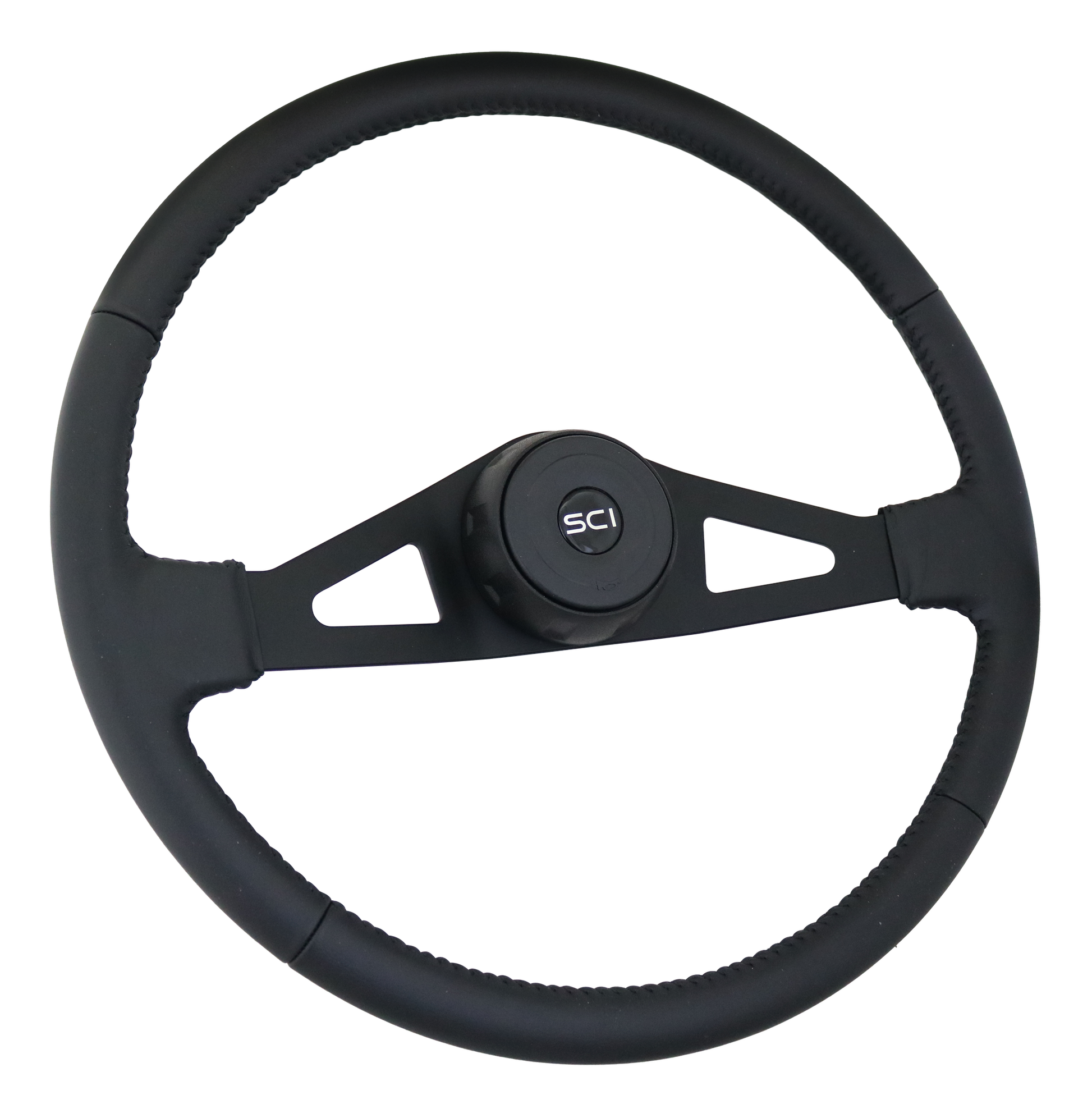 Pinion Leather - 20" Black Leather Rim, Black 2-Spoke w/Triangle Cut Outs, Blk Bezel, Blk Horn Button w/Black SCI Logo