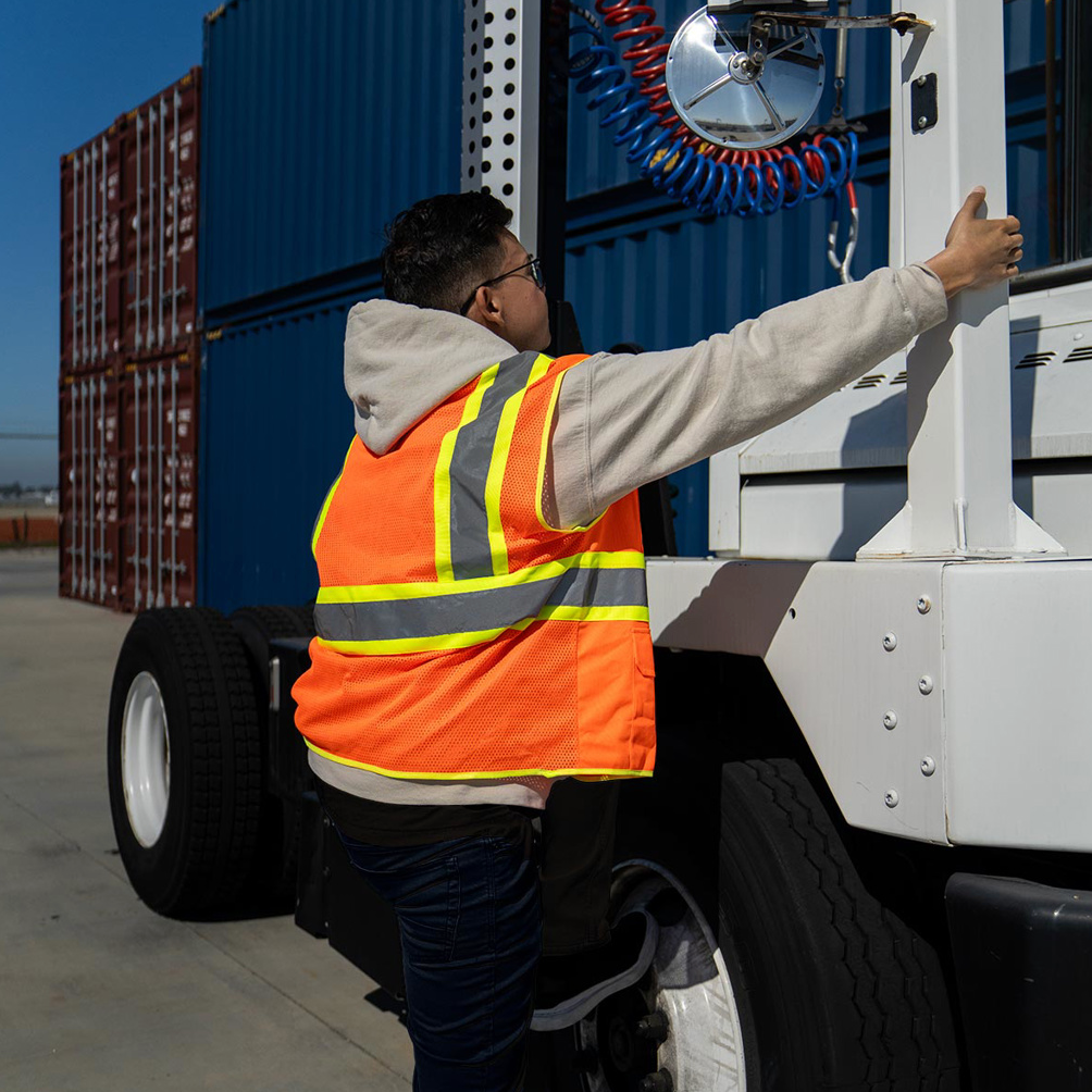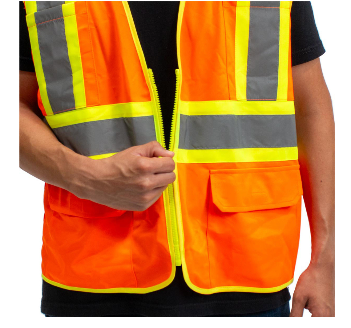 - Bright high visibility orange safety vest with reflector strips.