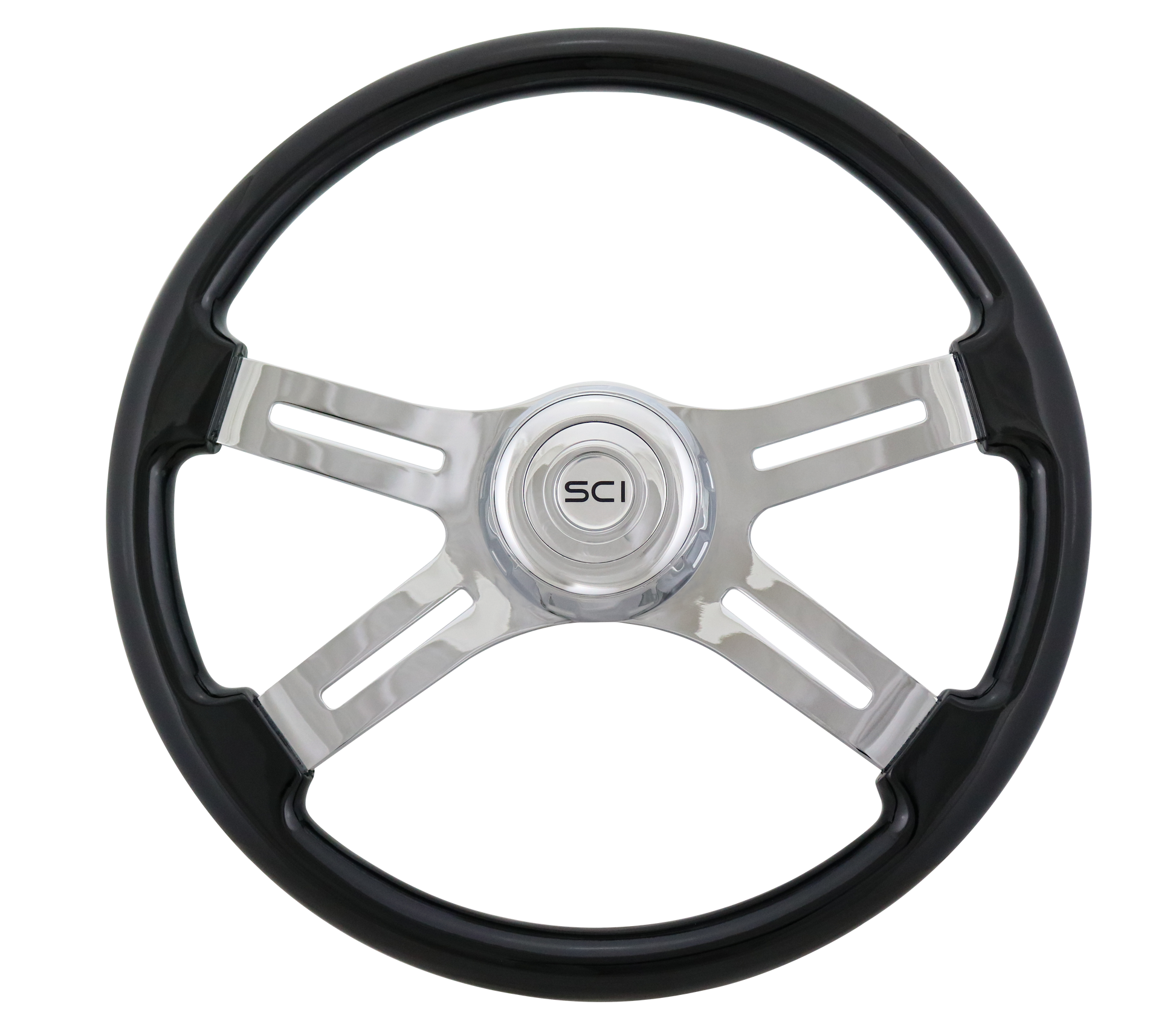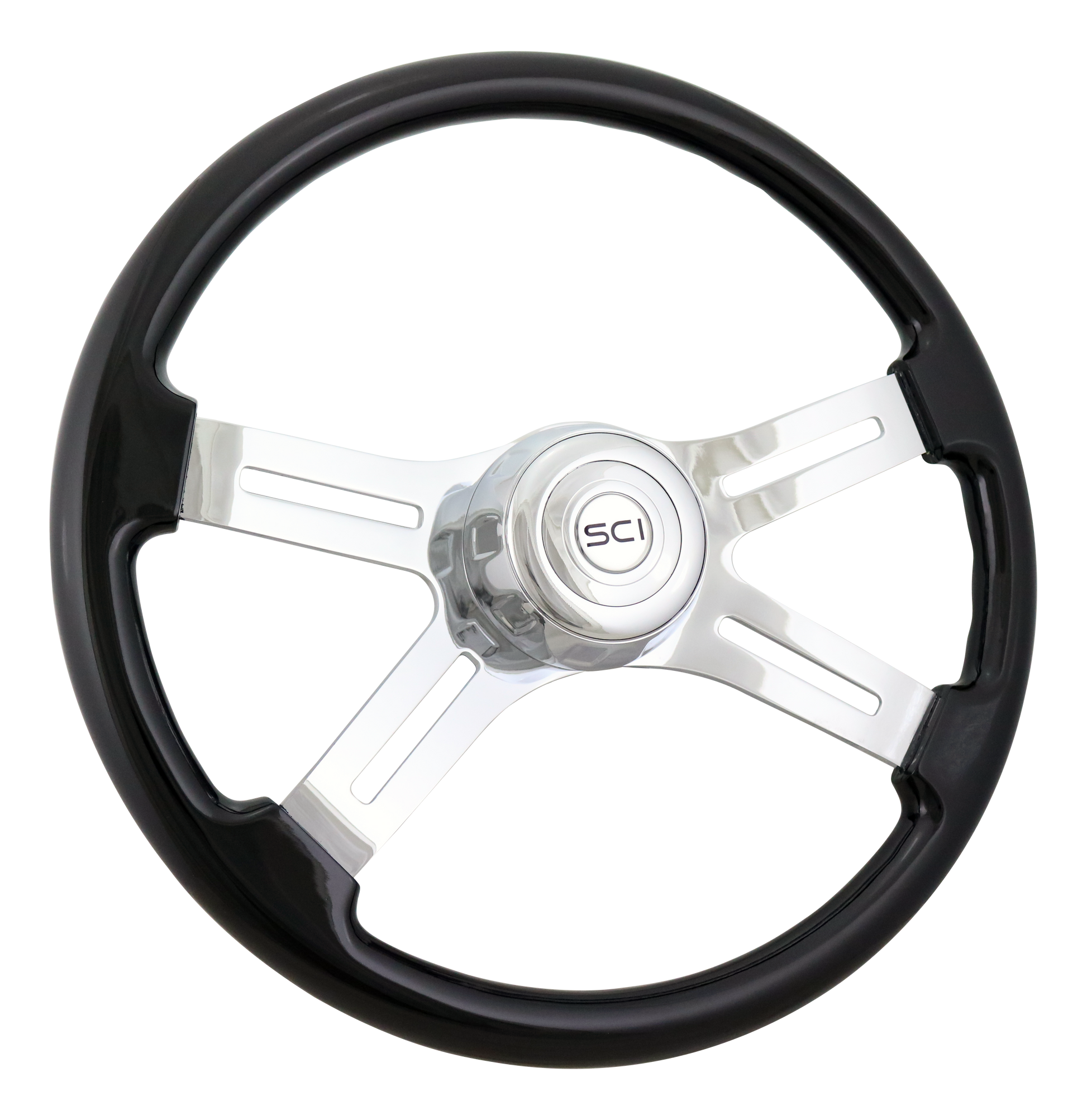 Steering Wheel 18" Classic Black, Chrome 4-Spoke, Chrome 4-Spoke w/ Slot Cut Outs.