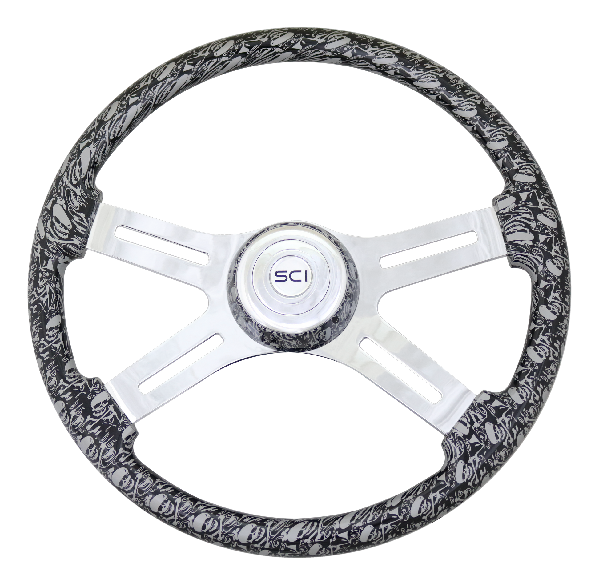 Steering Wheel Skulls Silver. Matching bezel. Skulls Silver - 18" Printed Wood Rim, Chrome 4-Spoke w/ Slot Cut Outs