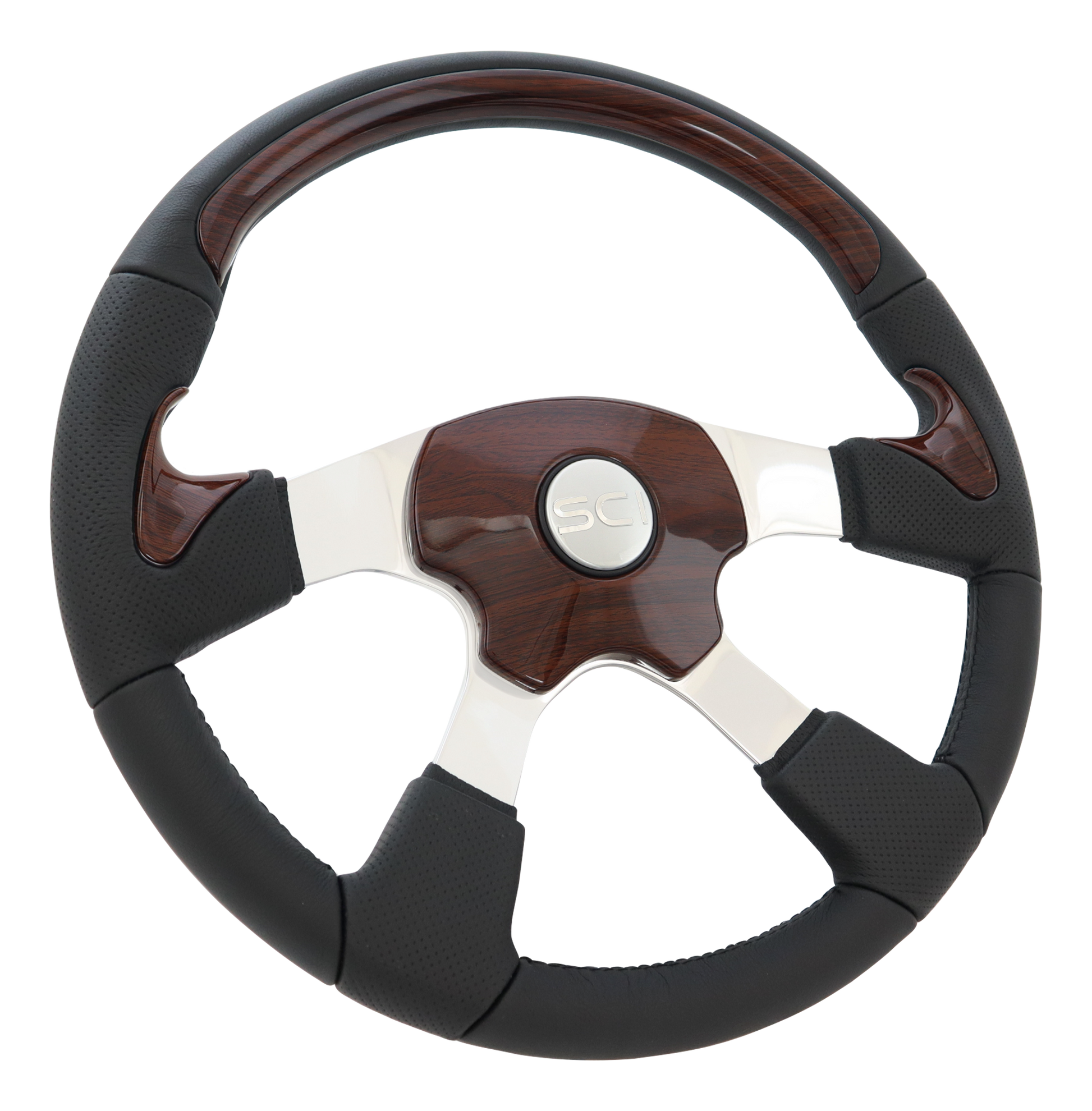 Traveler Mahogany - 18" Leather Rim with Mahogany Look Inserts, Polished Alum. 4-Spoke, Elite 4 Mahogany Look Pad, SCI Silver HB