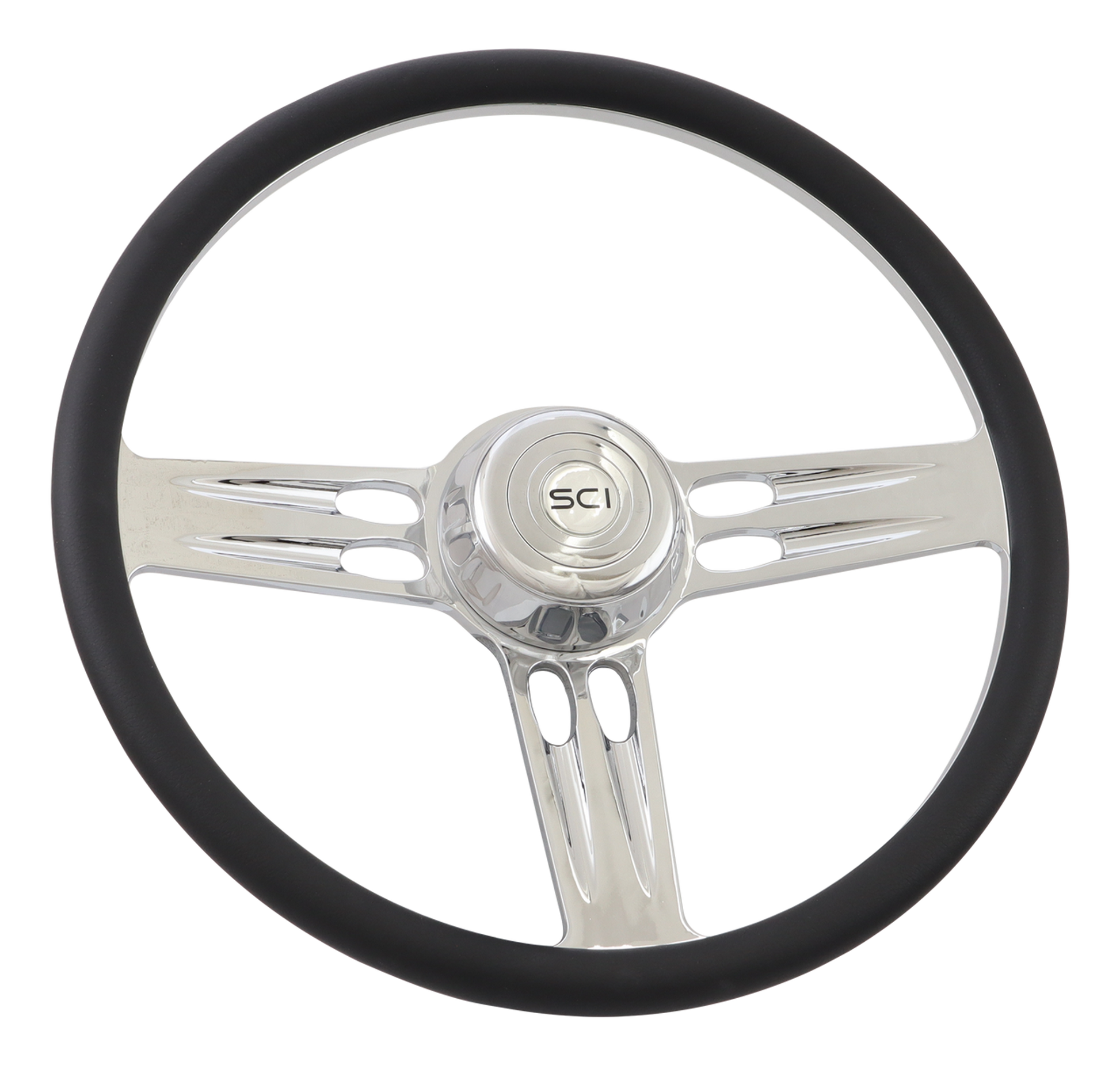 Triple Threat - 18" Half Wrap Billet Chrome Aluminum 3-Spoke w/18" Black Leather Rim, Chrome Bezel, Chrome Horn Button - SCI Logo